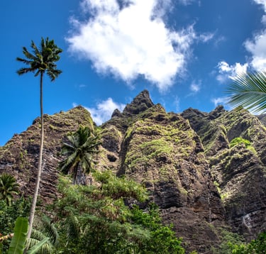 The Marquesas Islands are characterized by dramatic landscapes, towering volcanic peaks, lush valleys, and deep, fertile valleys. These high islands contrast with the atolls found in other parts of French Polynesia, providing a unique and visually striking environment.
